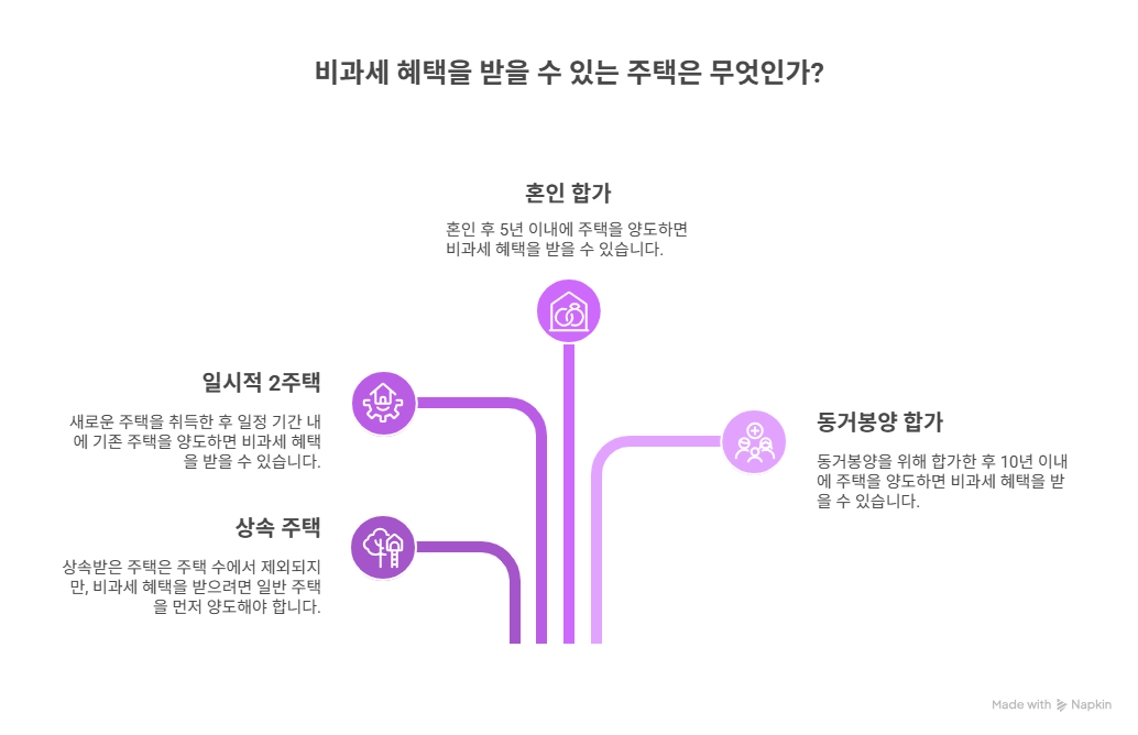• 혼인 합가로 인한 2주택: 1주택을 소유한 남녀가 혼인하여 1세대가 2주택을 보유하게 된 경우, 혼인한 날로부터 5년 이내에 먼저 양도하는 주택은 1세대 1주택 비과세 규정을 적용받을 수 있습니다. (소득세법 시행령 제155조 제5항)